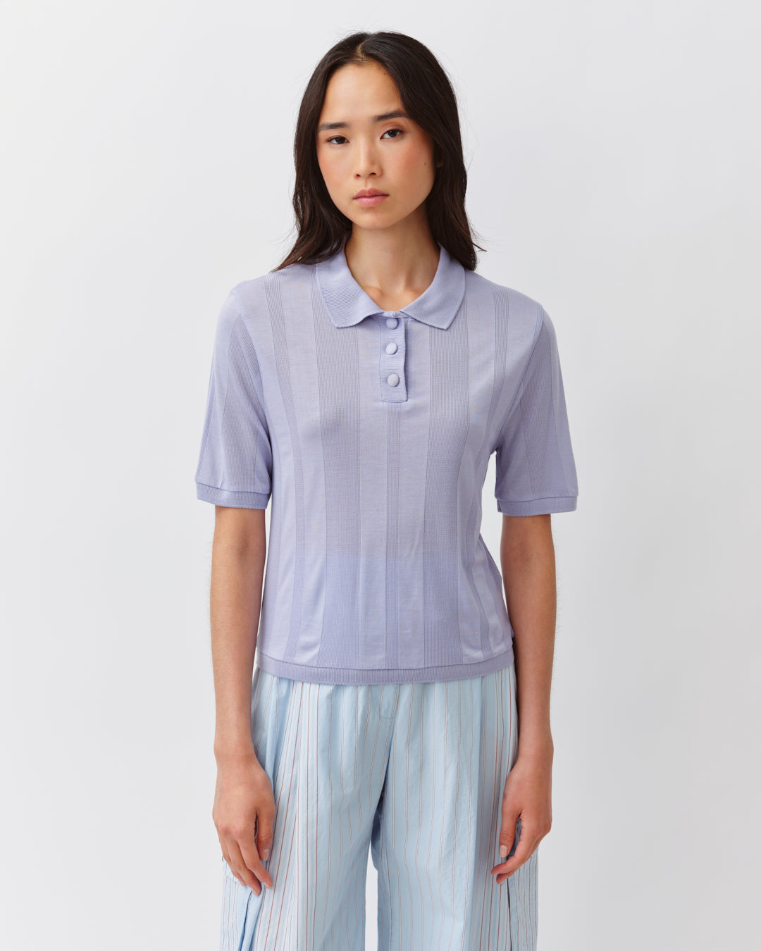 Le polo PLUKO parme présente une coupe droite et un col en maille contrasté. Il se ferme par une patte à trois boutons sur le devant. Les bords de manches et le bas sont terminés par des finitions côtelées pour un maintien souple. Réalisé dans une maille douce et respirante, il offre un porté confortable et décontracté.
