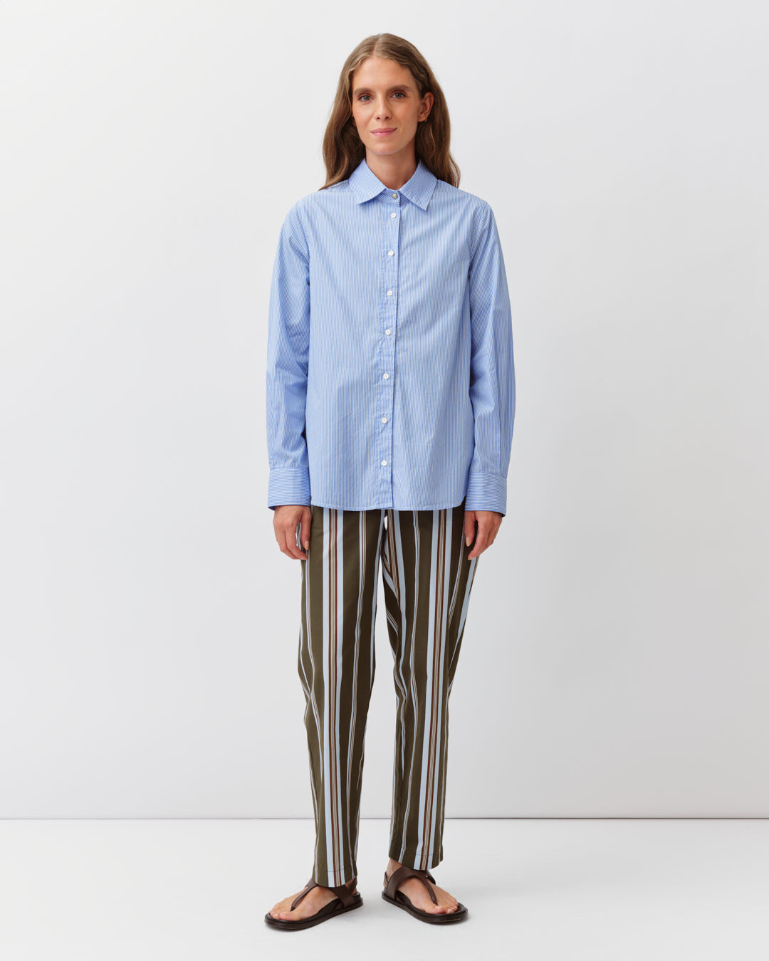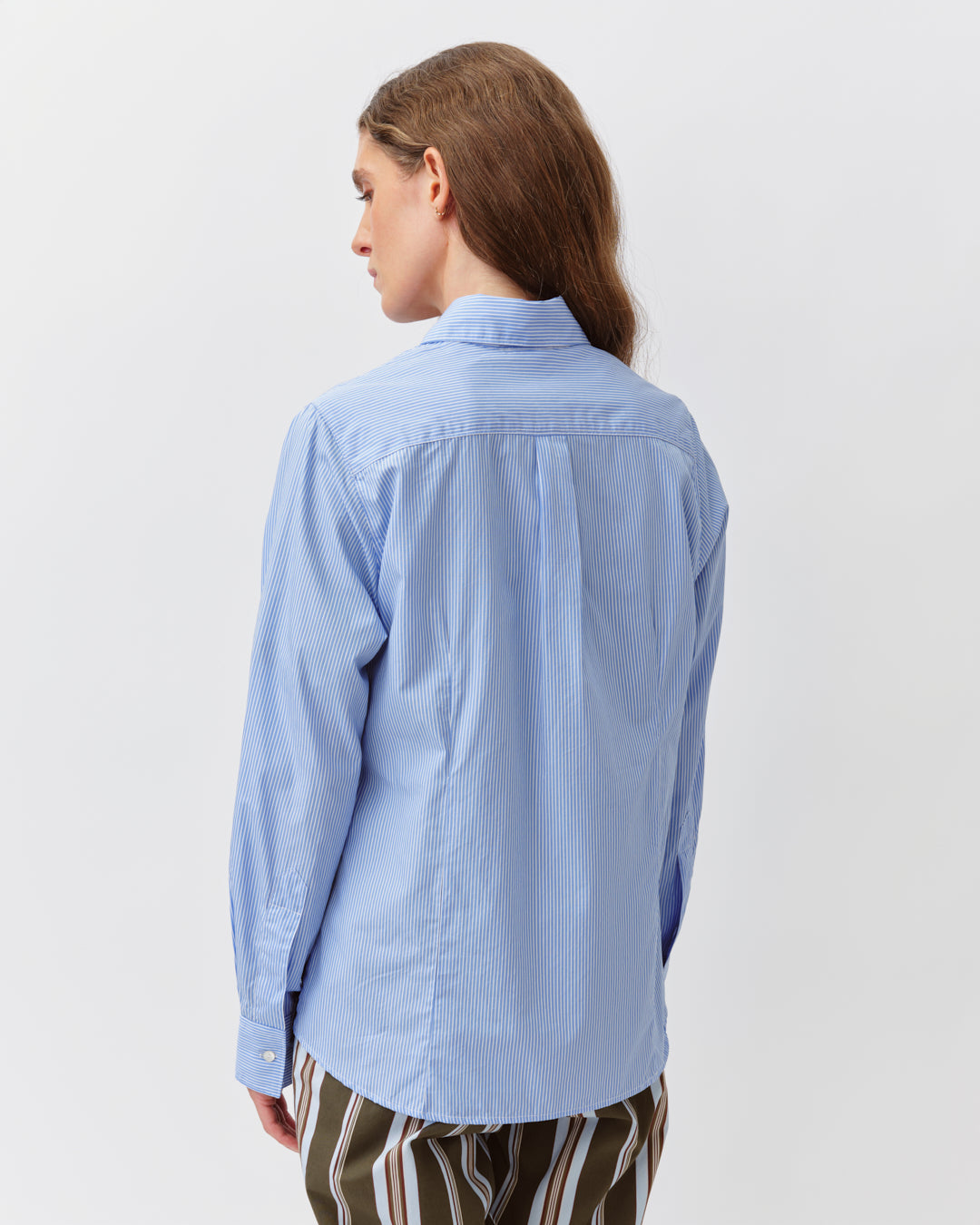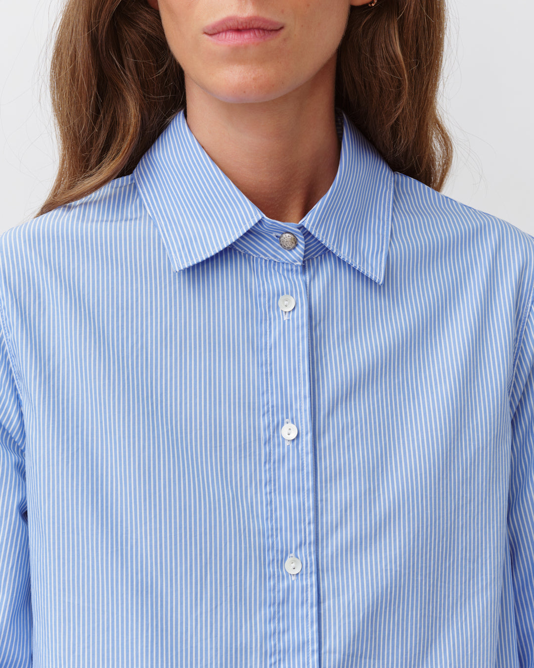 Chemise droite à la coupe ajustée et féminine. Col classique et fermeture boutonnée sur le devant. Manches longues resserrées aux poignets par un bouton. Base légèrement arrondie et finitions précises pour une allure élégante et intemporelle.