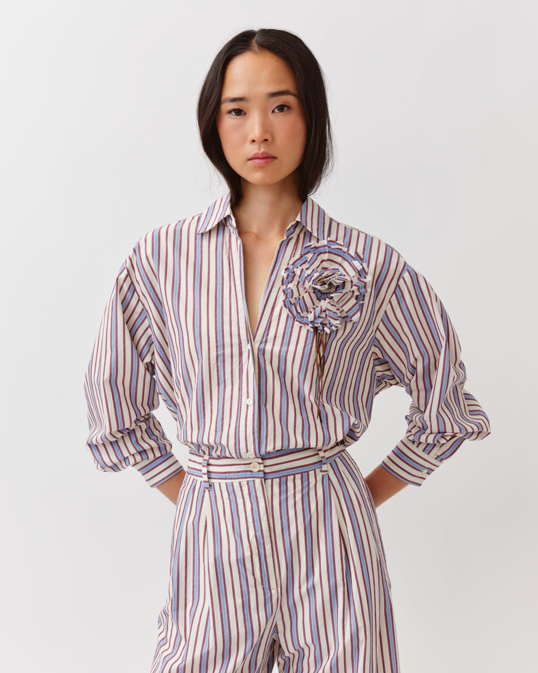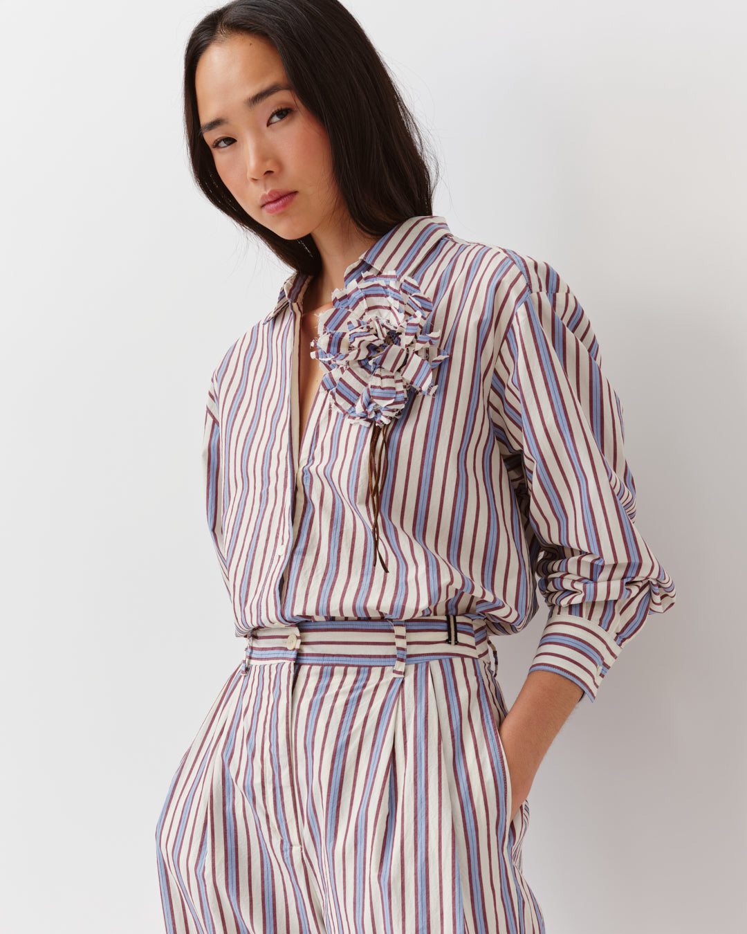 Broche en forme de fleur au volume aérien. Réalisée en tissu délicatement travaillé et ornée de fins cordons en cuir pour un contraste subtil de matières. Fermoir épingle au dos pour une fixation facile sur une veste, une chemise ou un sac. Un accessoire raffiné qui apporte une touche poétique et singulière à chaque tenue.