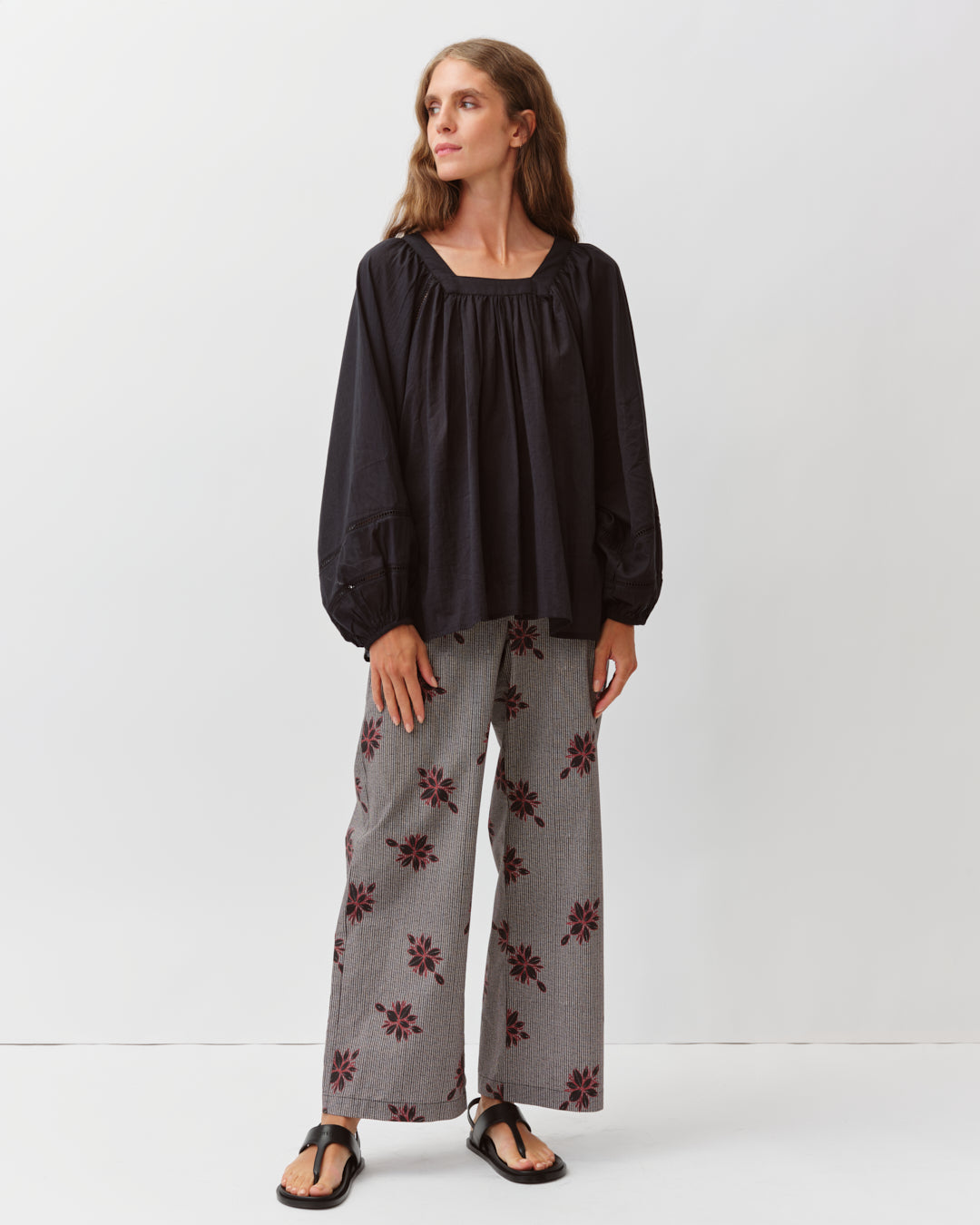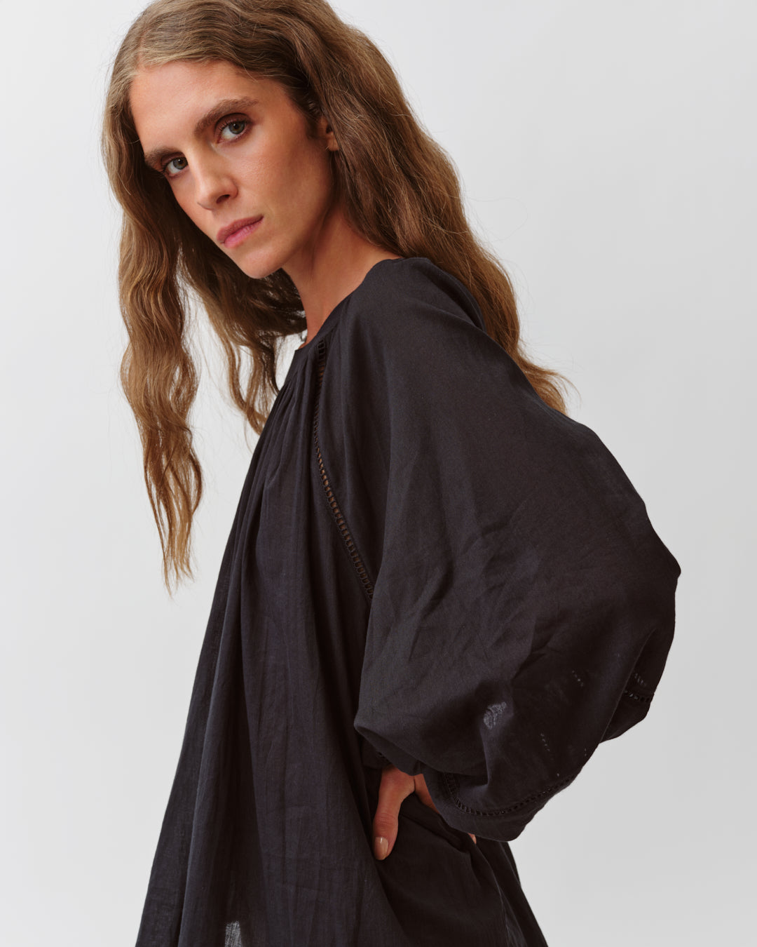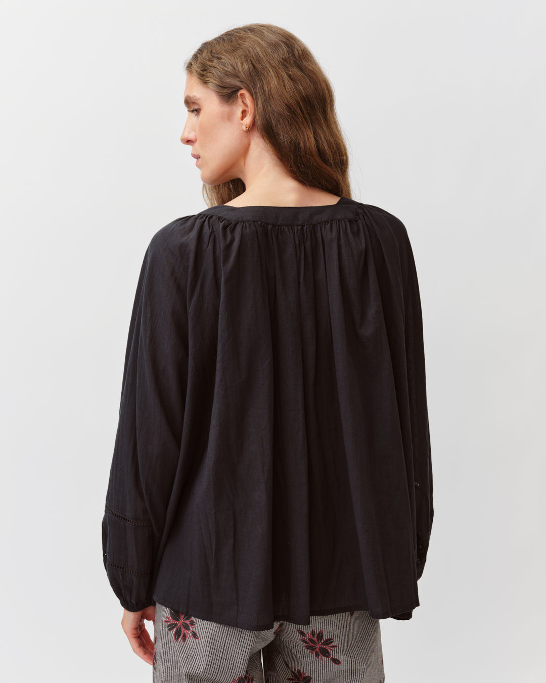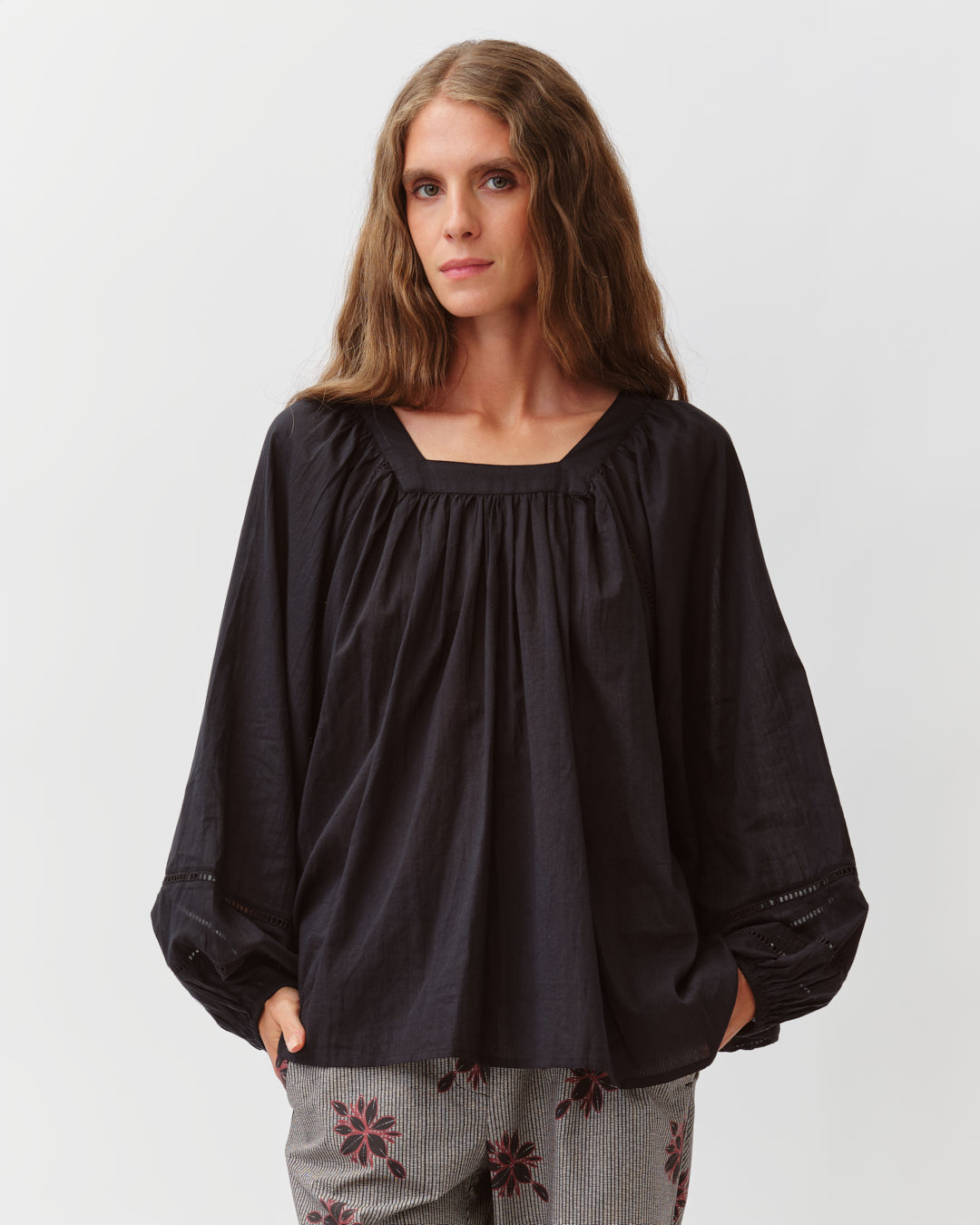 Le top TAZAO noir présente une encolure carrée et des manches longues amples resserrées aux poignets. Sa coupe fluide et ses fronces apportent du volume et de la légèreté. Une pièce au style bohème et féminin, idéale pour les journées d’été.