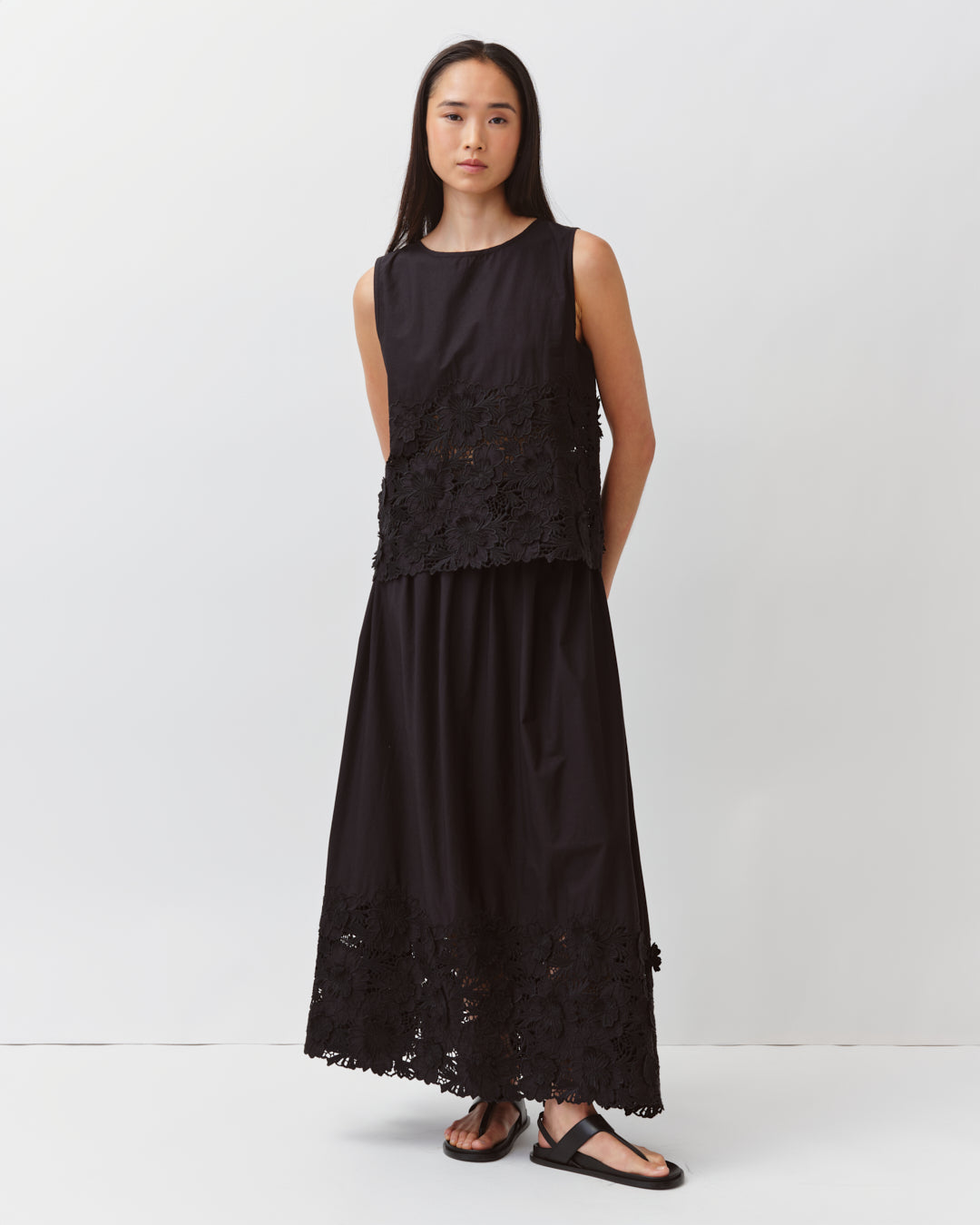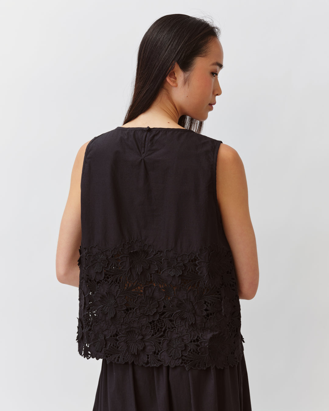 Le top TALWO est un modèle sans manches orné de broderies florales sur le bas. Il présente une coupe droite et un petit bouton au dos pour une touche délicate. Léger et raffiné, il se porte facilement sur un pantalon ou une jupe pour un look estival élégant.