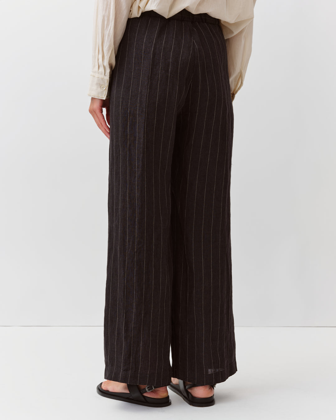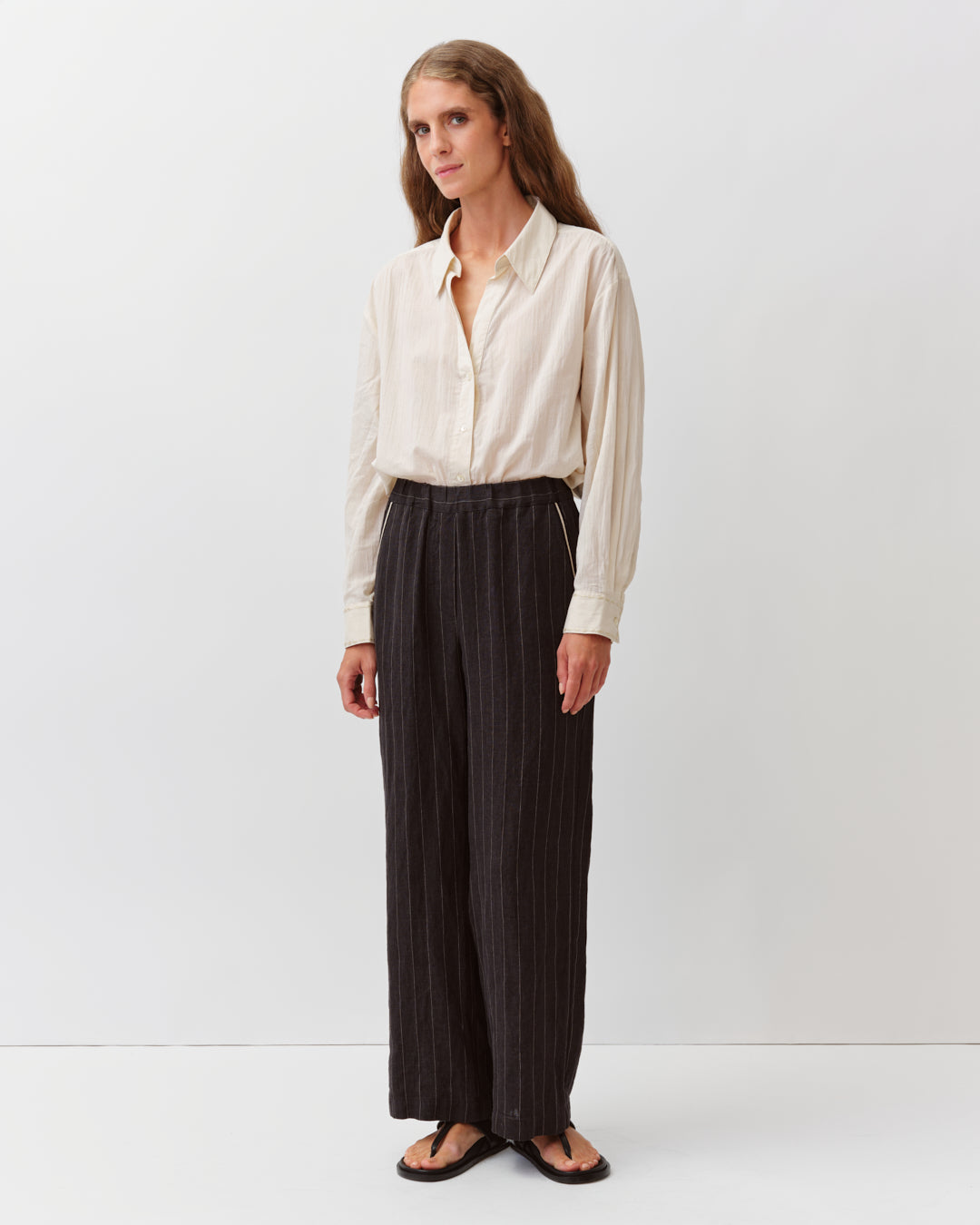 Pantalon à la coupe droite et ample. Taille élastiquée au dos pour plus de confort et ceinture plate sur le devant. Deux poches italiennes sur les côtés et fausse braguette. Longueur cheville pour une allure décontractée et moderne.
