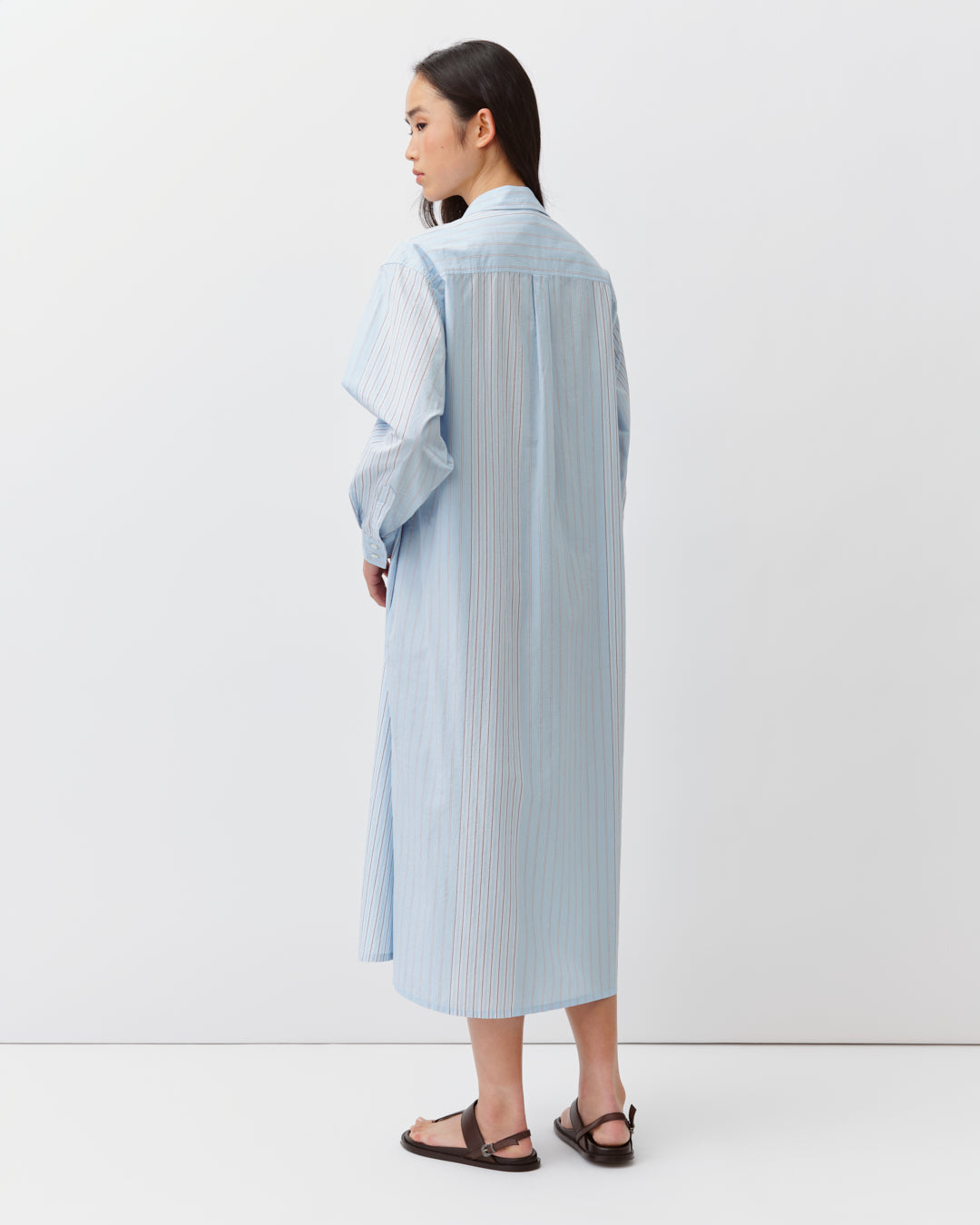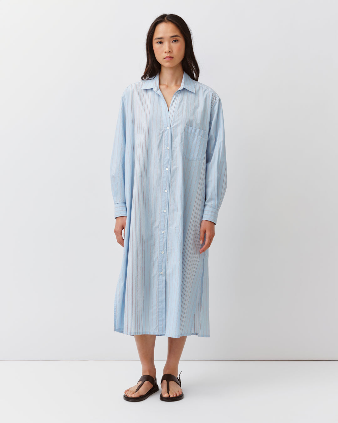Robe chemise longue à manches longues et poche plaquée sur la poitrine. Sa ligne fluide et légèrement évasée lui confère un tombé souple et naturel. Portée ouverte ou fermée, elle joue entre allure décontractée et élégance discrète, fidèle à l’esprit intemporel de DIEGA.