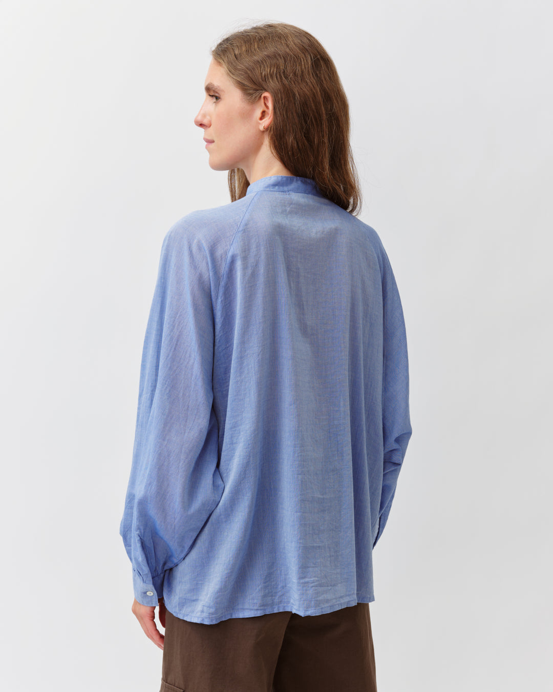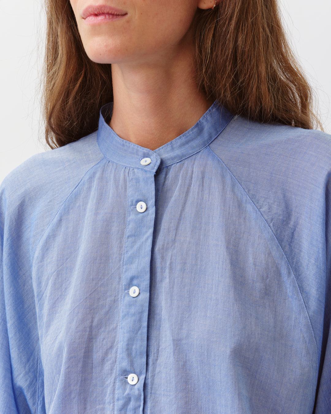 Chemise ample à l’encolure ronde et patte de boutonnage sur le devant. Manches longues raglan au volume généreux, resserrées aux poignets par un bouton. Coupe fluide et ligne arrondie pour une allure féminine et décontractée.