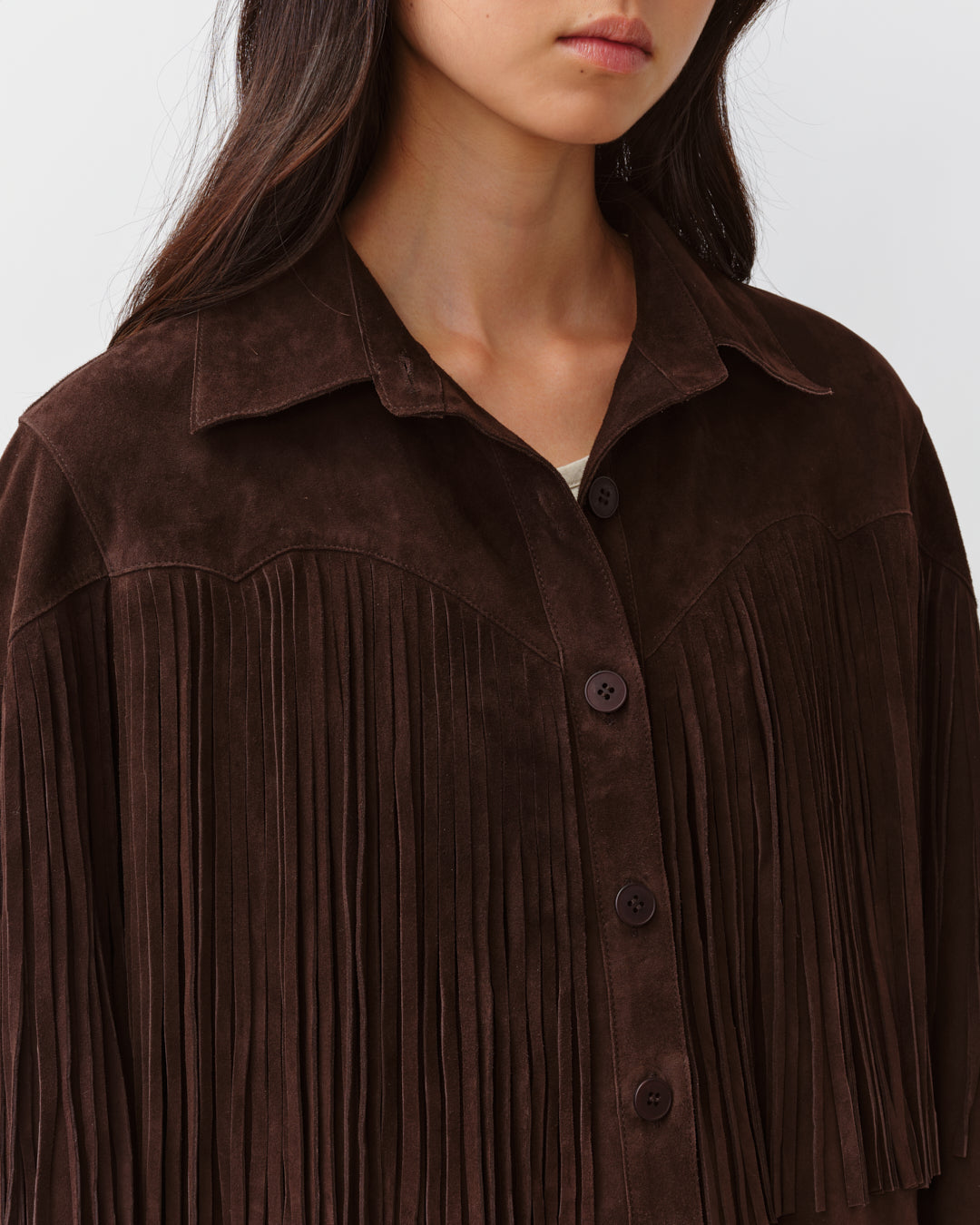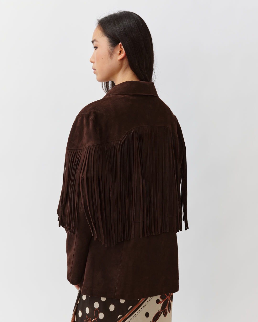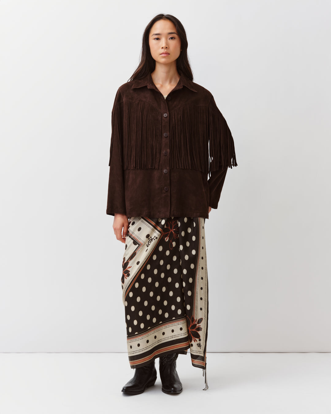 La veste VARIZONO revisite le style western avec ses franges placées sur le devant et le dos. Elle présente une coupe droite, un col chemise classique et une fermeture boutonnée, alliant esprit vintage et allure contemporaine.