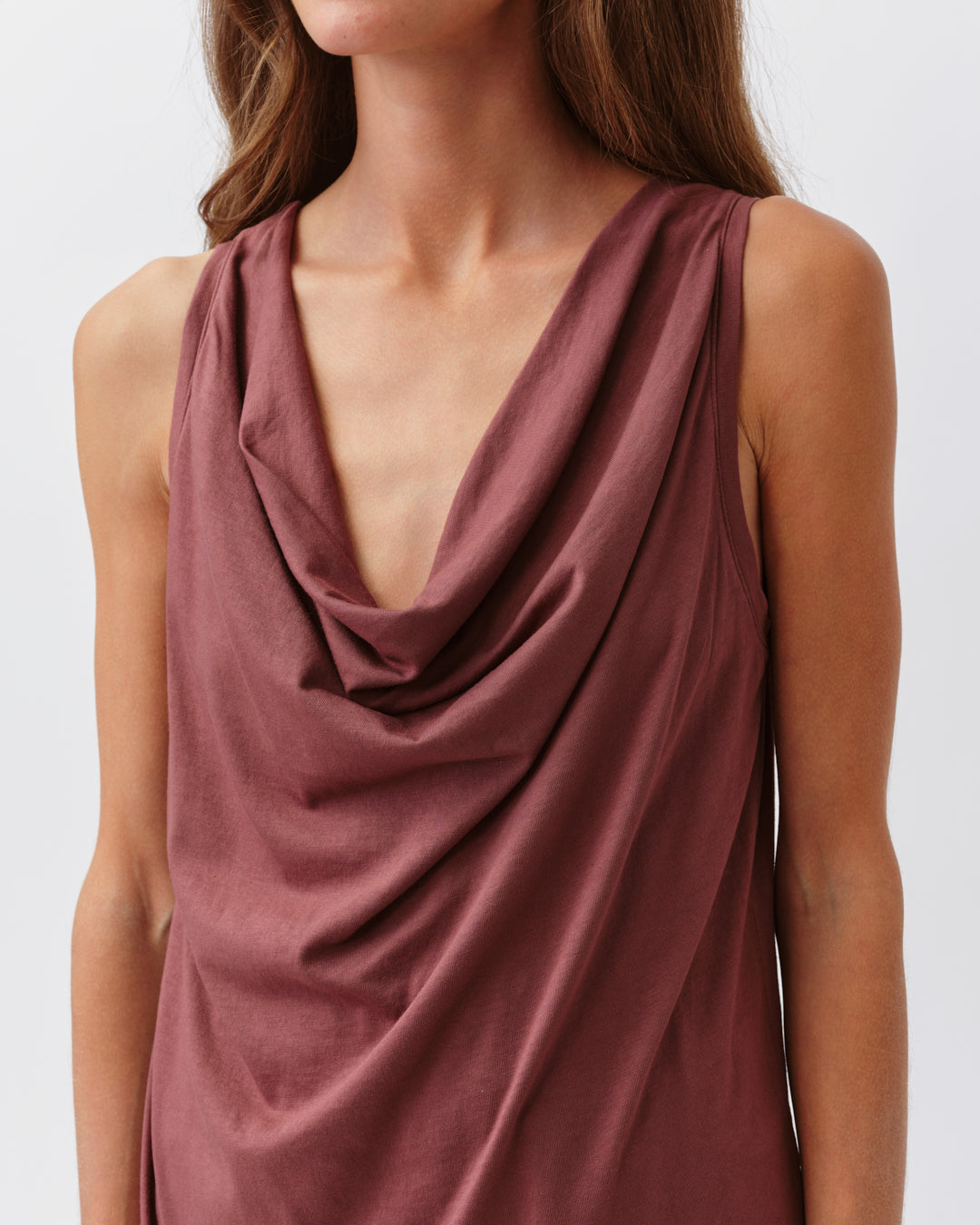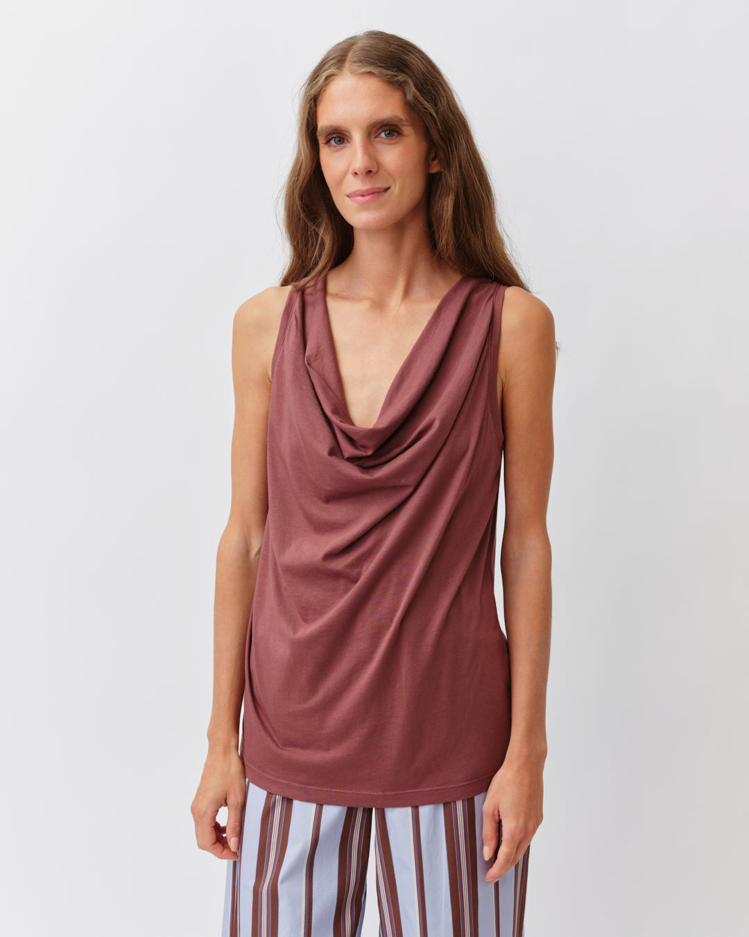 Le débardeur TENIO canelle est un modèle à col drapé au tombé fluide. Sa coupe ajustée et son tissu léger en font une pièce féminine et confortable, idéale seule ou sous une veste.