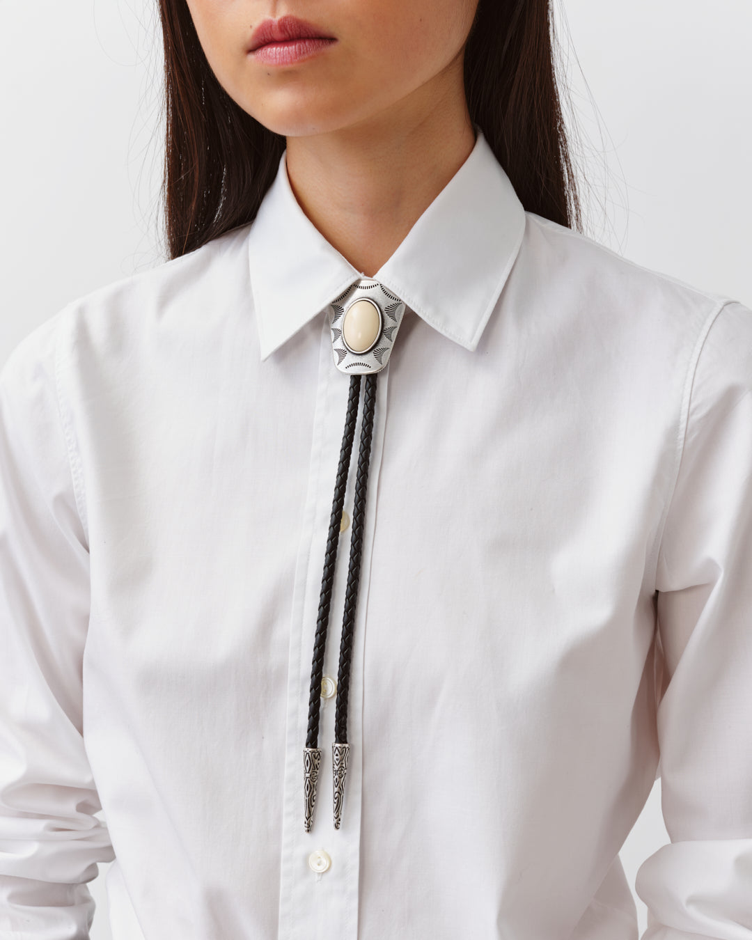 Collier bolotie à cordon tressé noir, orné d’un médaillon central ovale à finition argent vieilli et pierre colorée. Les embouts métalliques ciselés ajoutent une touche artisanale et singulière. Une pièce inspirée de l’Ouest américain, à porter comme un accent fort sur une chemise ouverte ou un tailleur pour un twist bohème et contemporain.